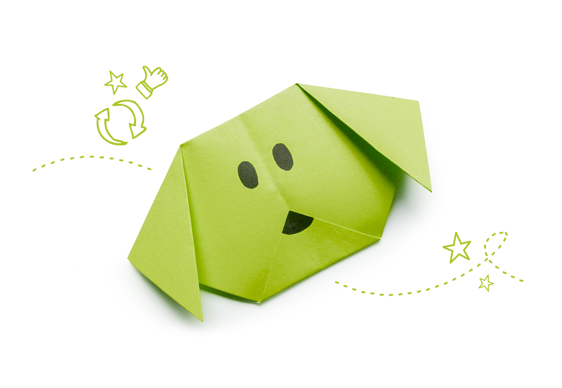 Découpez un carré au milieu de votre boîte. Pliez le carré en 2 pour former un triangle. Formez les oreilles en rabattant chaque côté du triangle. Enfin, relevez la pointe centrale du triangle pour former le museau. Dessinez-lui le visage que vous souhaitez.