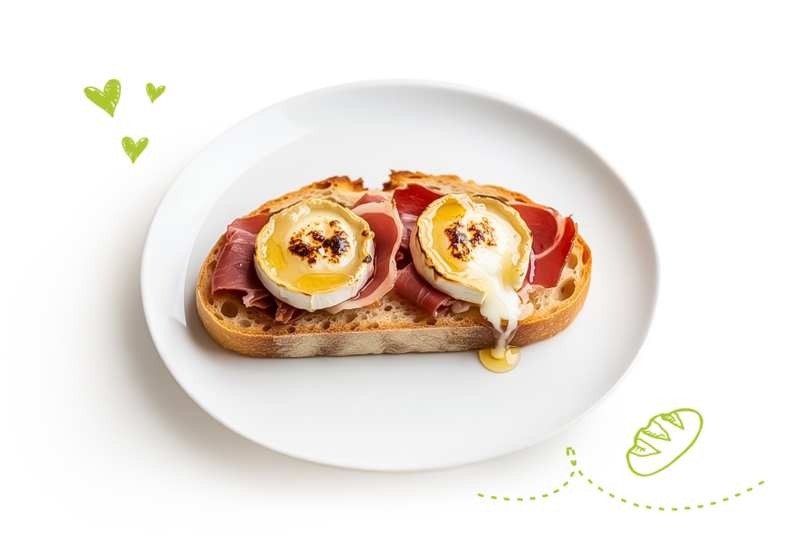 Coupez une large tranche de votre pain. Étalez généreusement du miel. Dispersez des tranches de jambon cru sur le pain. Coupez une buchette de chèvre en rondelles et posez-les dessus. Enfin, faites dorer votre tartine au four. Le tour est joué !